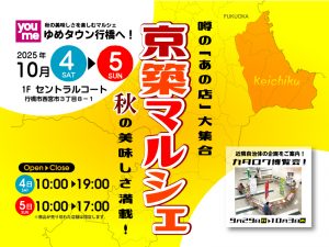 ゆめタウン行橋で『京築マルシェ』を開催します! 行橋市を中心に京築(筑)の店舗がゆめタウンのセントラルコートに集まり自慢の商品を販売します。人気の商品やTVにも出演した店舗も大集合!秋を感じる『京築マルシェ』にご来店ください! ポスター 開催日程 日時 令和7年10月4日(土)~5日(日) 時間 / 10:00-19:00 ※5日は17:00まで 場所 ゆ ...